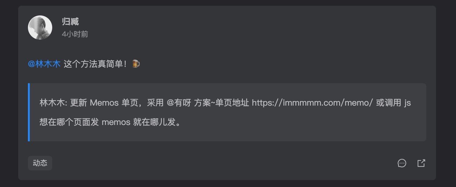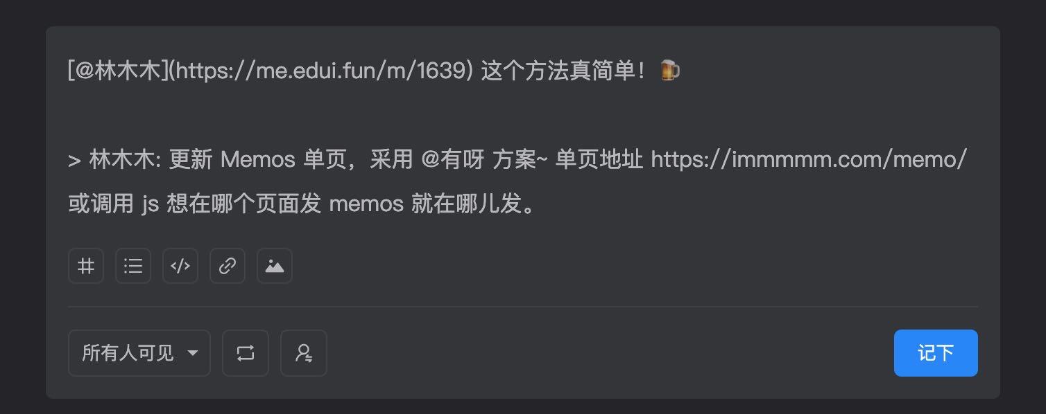 木木的「广场」页面,其实已经非常趋近于微博。发布框加上后,功能已经非常完整了。所以当你拥有了一个Memos广场页面,并且加上了发布框。这个转发的功能,也可以折腾起来了。